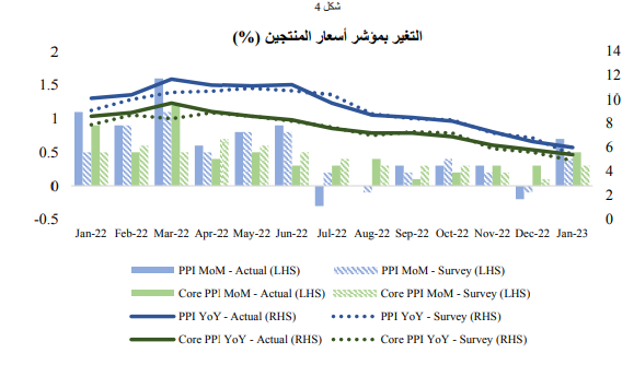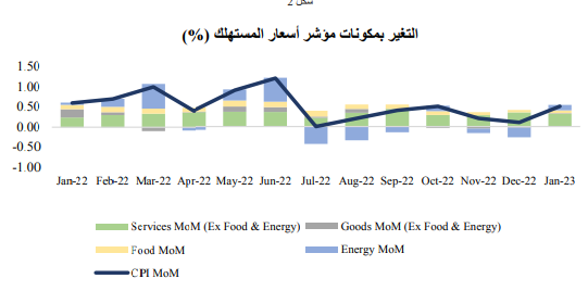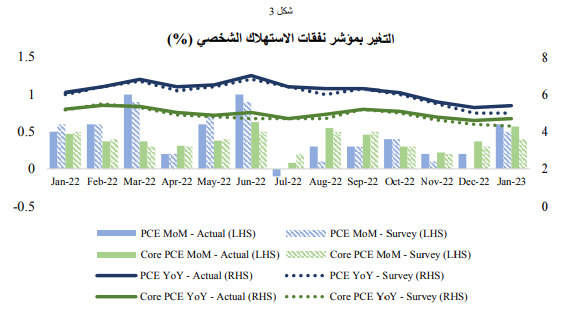 وأشارت بيانات التضخم، بما في ذلك مؤشر أسعار المستهلك (الشكل رقم ١)، ومؤشر نفقات الاستهلاك الشخصي (الشكل رقم 3)، ومؤشر أسعار المنتجين (الشكل رقم 4)، إلى ارقم 3)، ومؤشر أسعار المنتجين (الشكل رقم 4)، إلى استمرار ضغوط الأسعار، حيث شهدت المؤشرات الاقتصادية الثلاثة زيادة شهرية غير متوقعة في معدل التضخم العام، وذلك وفقًا لبيانات التضخم لشهر يناير. وعلى الرغم من أن أسعار الطاقة ساهمت بقوة في ارتفاع التضخم خلال شهر يناير، إلا أن باقي مكونات مؤشر أسعار المستهلك (الشكل رقم 2)، مثل تكاليف الغذاء، والمسكن، والنقل أظهرت نموًا مستمراً على مدار الشهرين الماضيين. وسلطت بيانات التضخم لشهر يناير الضوء على أمرين: أولهما أن التضخم قد يكون أشد رسوخًا مقارنةً بتوقعات الكثيرين، وثانيهما أن الاستهلاك بالولايات المتحدة يتسم بالصلابة، مما يمهد الطريق أمام الاحتياطي الفيدرالي للاستمرار في زيادة تشديد السياسة النقدية بوتيرة أقوى.