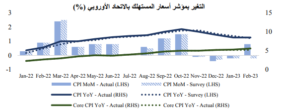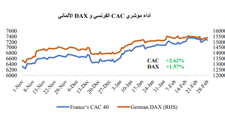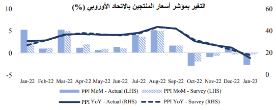 وبالمثل، سجلت بيانات مؤشر أسعار المستهلك في الاتحاد الأوروبي ارتفاعا خلال شهر فبراير على عكس التوقعات، وذلك بعد تباطؤ دام لمدة ثلاثة أشهر، وتصاعد معدل التضخم الأساسي إلى مستوى قياسي جديد على أساس سنوي، مما أدى الى تلاشي الآمال بأن تتراجع الضغوط على الأسعار. بالإضافة إلى ذلك، صعدت معدلات التضخم على نحو مفاجئ في أكبر ثلاثة اقتصادات في المنطقة: ألمانيا وفرنسا وإسبانيا، مما يشير إلى احتمالية تأثر بلدان أخرى في أوروبا. وعلى العكس من ذلك، أظهرت بيانات مؤشر أسعار المنتجين لشهر يناير، والتي صدرت في شهر فبراير، هبوط مفاجئ وهو ما يرجع بشكل رئيسي إلى تراجع أسعار الغاز الطبيعي.