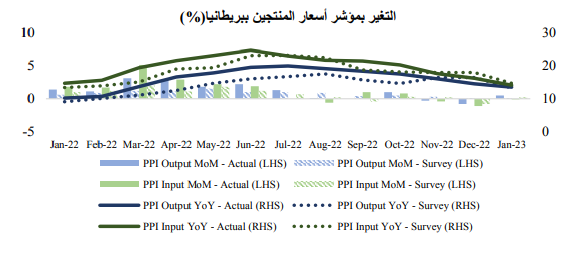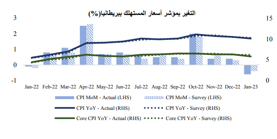 وعلى عكس نظرائها، تباطأت قراءات مؤشر أسعار المستهلك ومؤشر أسعار المنتجين بشكل أسرع مما كان متوقعًا لشهر يناير في المملكة المتحدة، وكانت هذه البيانات قد صدرت على مدار الشهر. وعلى الرغم من تراجع مستوى التضخم، إلا أن مؤشر أسعار المستهلك في بريطانيا لا يزال ثابت عند 10.1% على أساس سنوي، وهو أعلى بكثير من بيانات مؤشر أسعار المستهلك في الولايات المتحدة ومنطقة اليورو. ويرجع انخفاض التضخم إلى عدم توازن سوق العمل وعوامل أخرى مثل خروج بريطانيا من الاتحاد الأوروبي، مما يشير إلى احتمالية تفاقم أزمة تكلفة المعيشة.