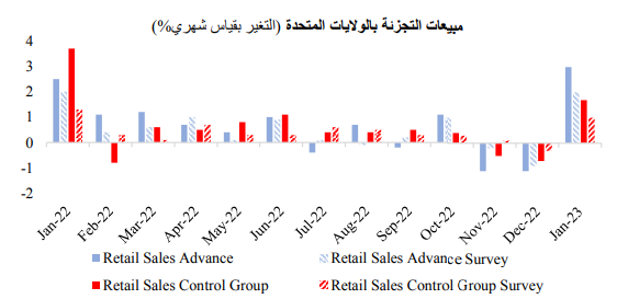 وقد قفزت مبيعات التجزئة الأمريكية بنسبة 3%، لتسجل أكبر ارتفاع لها فيما يقرب من عامين، وذلك خلال شهر يناير بعد سلسلة من الخسائر استمرت لشهريين متتاليين. وجاء هذا الارتفاع نتيجة لزيادة نسبة المشتريات من السيارات وغيرها من السلع.