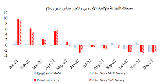 وفي أوروبا، تراجعت مبيعات التجزئة كما كان متوقع في شهر دبا، تراجعت مبيعات التجزئة كما كان متوقع في شهر ديسمبر، متماشيًا مع التوقعات، لتسجل بذلك انخفاضها الشهري للمرة الثالثة على التوالي.
