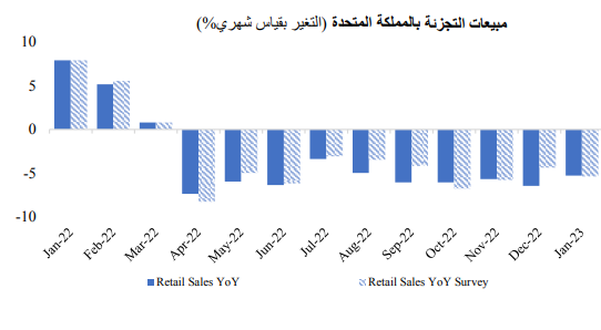 واتبع المستهلكون في المملكة المتحدة خطى نظرائهم في الاتحاد الأوروبي، حيث انخفضت مبيعات التجزئة بوتيرة أبطأ من المتوقع على خلفية ارتفاع تكاليف السلع والخدمات بصورة أسرع من الأجور، مما يُضعف من القوة الشرائية للأفراد.