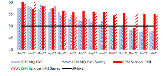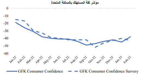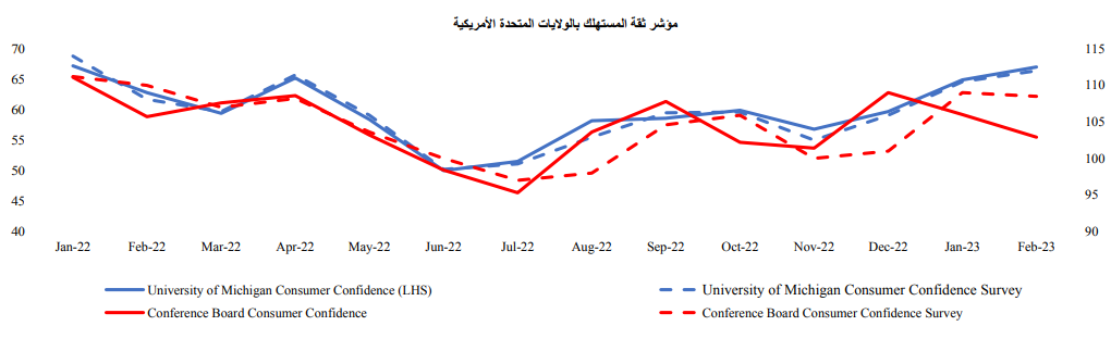 وفيما يتعلق بثقة المستهلك في الولايات المتحدة، سجلت بيانات مؤشر ثقة المستهلك بجامعة ميشيجان لشهر فبراير أعلى مستوى لها منذ شهر يناير 2022، وجاءت أعلى من المتوقع. ولكن في وقت لاحق من الشهر، انخفض المؤشر بشكل مفاجئ على خلفية تدهور التوقعات حيال النمو الاقتصادي خلال الستة أشهر المقبلين وهو مما طغى على تأثير صلابة سوق العمل