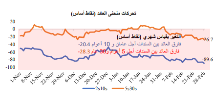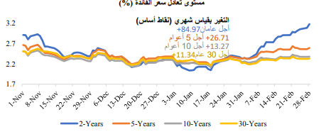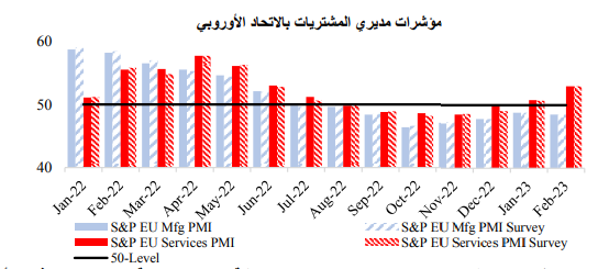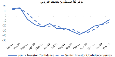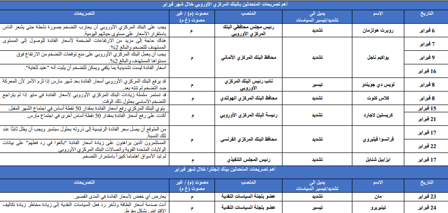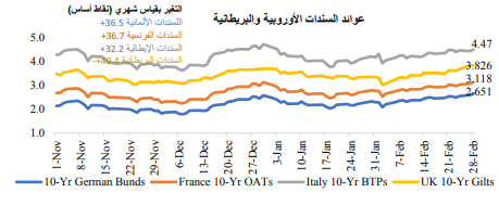 وارتفعت عوائد سندات الخزانة الأوروبية في شهر فبراير، حيث ظهر اقتصاد الاتحاد الأوروبي بشكل أقوى مما كان متوقعا، والذي دفع الأسواق إلى تسعير زيادة وتيرة تشديد السياسة النقدية، خاصةً بعد بقاء التضخم الأساسي عند أعلى مستوياته في التاريخ. وأعلن صانعو السياسة بالبنك المركزي الأوروبي بشكل صريح عن دعمهم لرفع سعر الفائدة بمقدار 50 نقطة أساس. وعلى الرغم من ذلك، لا يزال مسار رفع بنك إنجلترا لسعر الفائدة غير واضح المعالم.