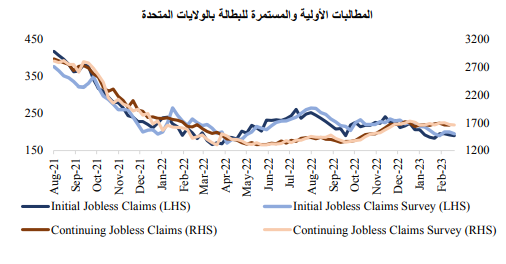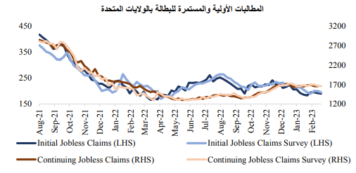 على الرغم من عمليات التسريح الضخمة للعمالة والتي أعلنت عنها الشركات الكبرى، استمرت مطالبات البطالة في الإشارة إلى أداء أفضل من المتوقع لسوق الوظائف، وهو ما أضاف إلى الآمال بأن الاقتصاد قد يواجه فقط انكماشًا بسيطاً، لكنه قد يدفع بنك الاحتياطي الفيدرالي إلى إبقاء أسعار الفائدة مرتفعة لفترة أطول.