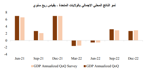 تم خفض القراءة الثانية للناتج المحلي الإجمالي في الولايات المتحدة للربع الرابع من عام 2022 خلال الشهر، وهو ما يتماشى مع التوقعات ولكنها جاءت أقل من قراءة الشهر السابق وأقل بكثت ولكنها جاءت أقل من قراءة الشهر السابق وأقل بكثير من قراءة الربع السابق.
