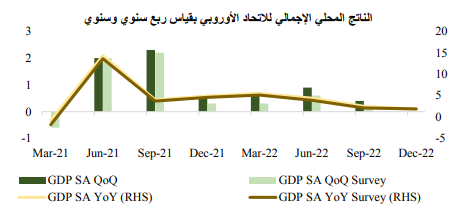 أظهرت بيانات الناتج المحلي الإجمالي للاتحاد الأوروبي أنه قد تمكن من تجنب الركود، حيث نما الناتج المحلي الإجمالي للبلاد بنسبة 0.1% على أساس ربع سنوي وذلك في الربع الرابع من العام الماضي، متماشياً مع توقعات المحللين ولكنه جاء أبطأ من نمو الربع الثالث الذي جاء عند 0.3%. أما بالنسبة لنمو الناتج المحلي الإجمالي على أساس سنوي، فقد سجل نمواً بنسبة 1.9% كما كان متوقعًا، وهو أقل من الربع السابق.