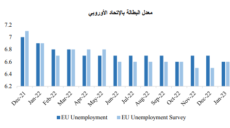 وعلى صعيد سوق العمل في الاتحاد الأوروبي، جاء معدل البطالة لشهر ديسمبر، والذي صدرت بياناته خلال شهر فبراير، متماشيا مع التوقعات، ولكنه اقل من معدل شهر ديسمبر.