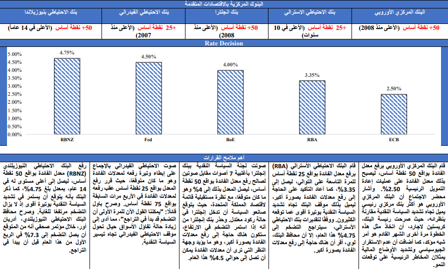 أبقت معظم البنوك المركزية بالأسواق الناشئة معدلات الفائدة الرئيسية كما هي دون تغيير، مما يشير إلى اقتراب نهاية دورات تشديد السياسة النقدية في العديد من البلدان. هذا يمكن تفسيره بشكل جزئي من خلال اختلاف ديناميكيات سوق العمل والتضخم التي تشهدها الأسواق المتقدمة بشكل طفيف عن تلك التي تشهدها بعض دول الأسواق الناشئة، حيث بدأت بعض البنوك المركزية بالأسواق الناشئة في دورات تشديد السياسة النقدية قبل بدء الاحتياطي الفيدرالي الأمريكي في رفع معدلات الفائدة. وعلى الرغم من ذلك، استمرت الدول، التي لديها أنظمة سعر صرف مرتبط بالدولار، وكذلك المكسيك، في رفع معدلات الفائدة بعدما قام الاحتياطي الفيدرالي برفع الفائدة لأول مرة خلال عام 2023 في نهاية شهر يناير.