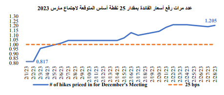 عقب اجتماع اللجنة الفيدرالية للسوق المفتوحة بالبنك الاحتياطي الفيدرالي وتصريحات مسؤولي البنك، أشارت العقود الآجلة للصناديق الفيدرالية إلى زيادة توقعات الأسالآجلة للصناديق الفيدرالية إلى زيادة توقعات الأسواق برفع معدلات الفائدة، حيث أصبحت توقعات المتداولين أكثر اتساقًا مع خطة الاحتياطي الفيدرالي بعدما بلغت نسبة احتمالية رفع معدل الفائدة بمقدار 50 نقطة أساس 20% مقارنة بنسبة 3% التي تم الإفصاح عنها في مطلع الشهر. علاوة على ذلك، قامت الأسواق بتسعير مسار أطول لرفع معدل الفائدة، حيث أشارت البيانات الصادرة في أخر الشهر ارتفاع معدل الفائدة النهائي لبنك الاحتياطي الفيدرالي بحوالي 50 نقطة أساس، كما أشارت هذه البيانات إلى أنه من المتوقع أن يصل معدل الفائدة النهائي إلى 5.41% خلال شهر سبتمبر 2023 مقارنًة بتوقعات الأسواق خلال الشهر السابق، والتي سعرت وصول معدل الفائدة النهائي إلى 4.91% خلال شهر يونيو 2023.