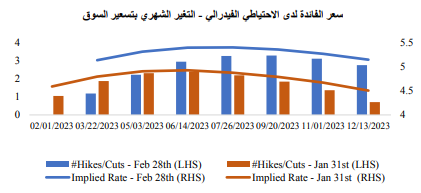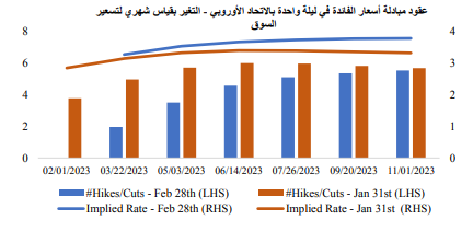 وعلى صعيد توقعات الأسواق الخاصة بالاتحاد الأوروبي، قامت الأسواق بتسعير معدل فائدة نهائي أعلى بكثير، حيث قيمت الأسواق أن تصل ذروة معدل الفائدة إلى 3.88% في نهاية شهر فبراير 2024 مقارنة بتسعيرهم وصول معدل الفائدة النهائي إلى 3.32% في الشهر السابق. كما استمرت الأسواق في تسعير زيادة معدل الفائدة بواقع 25 نقطة أساس خلال اجتماع شهر مارس، وذلك نظرًا لاستمرار المركزي الأوروبي في اتجاهه نحو تشديد السياسة النقدية.