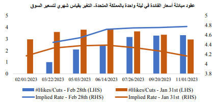 وبالمثل، زادت التوقعات الخاصة برفع بنك إنجلترا لمعدل الفائدة، حيث قامت الأسواق بتسعير معدل الفائدة النهائي عند 4.77% في شهر ديسمبر مقارنة بتسعيرهم 4.37% خلال الشهر السابق. كما زادت توقعات الأسواق برفع بنك إنجلترا لمعدل الفائدة بواقع 25 نقطة أساس خلال اجتماعه في شهر مارس بصورة ثابتة .