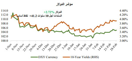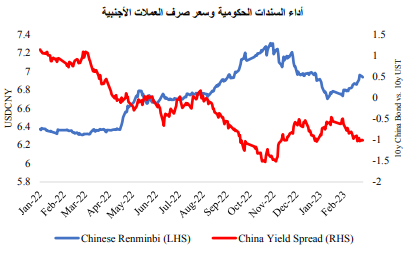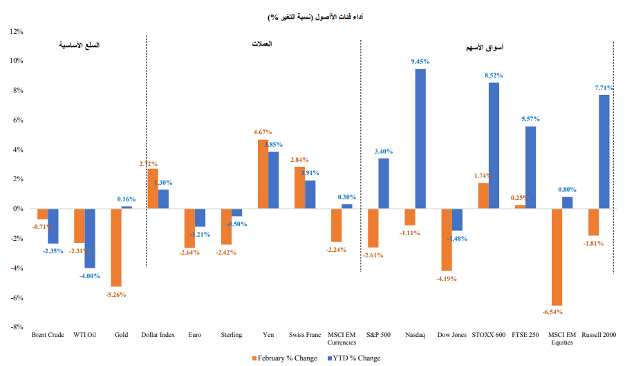 وخلال هذا الشهر، أدى ارتفاع مؤشر أسعار المستهلك بالولايات المتحدة بشكل غير متوقع، فضلًا عن صدور البيانات التي أظهرت صلابة الاقتصاد وقوة سوق العمل إلى دفع العديد من أعضاء الاحتياطي الفيدرالي إلى الإدلاء بتصريحات حول دعمهم لرفع معدل الفائدة بمقدار ٥٠ نقطة أساس خلال اجتماع شهر مارس، كما أدى صدور هذه البيانات الى تسجيل سندات الخزانة قصيرة الأجل لأعلى مستوى لها منذ الأزمة المالية التي حدثت في عام 2007. وبالمثل، رفع البنك المركزي الأوروبي معدل الفائدة بمقدار 50 نقطة أساس في بداية هذا الشهر، كما ارتفع معدل التضخم بعد تباطؤه لمدة شهرين، مما دفع العديد من أعضاء البنك المركزي الأوروبي إلى التأكيد على أنه ينبغي توقع استمرار تشديد السياسة النقدية بوتيرة أقوى. وظلت المخاوف من حدوث ركود في بؤرة الاهتمام، حيث قامت الأسواق بتقييم تشديد البنك المركزي للسياسة النقدية، وتقييم البيانات التي أشارت إلى أنه قد تم مراجعة بيانات الناتج المحلي الإجمالي بالولايات المتحدة، وأوروبا، وهونج كونج هبوطيًا. وظهرت التوترات السياسية مرة أخرى على الساحة، وذلك في ظل وجود تصعيد قوي للخلافات بين الولايات المتحدة والصين، حيث استمرت الصين في تعزيز أواصرها مع روسيا، إلى جانب الاشتباه في قيامها بالتفكير في إمداد روسيا بأسلحة فتّاكة. وفيما يتعلق بالكوارث الطبيعية، تشير التقديرات إلى أن الزلزال الذي ضرب تركيا وسوريا في وقت سابق من الشهر كبّد تركيا وحدها أضرار بقيمة 100 مليار دولار. ولإنقاذ سوقها من تكبد المزيد من الأضرار، اتخذت الحكومة التركية خطوات فعّالة على مدار الشهر، بما في ذلك التدخل في العملة.