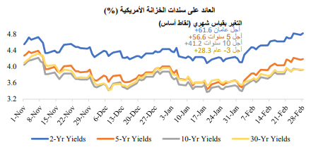 أدت قوة الأداء الاقتصادي وتصريحات مسؤولي الاحتياطي الفيدرالي المائلة نحو تشديد السياسة النقدية إلى رفع عوائد سندات الخزانة بشكل كبير، حيث أنهت عوائد سندات الخزانة لأجل عامين تداولات الشهر عند 4.819%، مسجلًة بذلك أعلى مستوى لها منذ 2007، كما ارتفعت عوائد السندات لأجل 5 أعوام، وأجل 10 أعوام إلى 4.216% و3.955% على التوالي، ليسجلا بذلك أعلى مستوى لهما منذ نوفمبر الماضي.