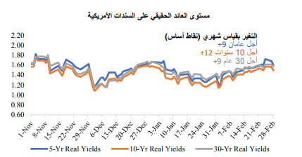 ارتفع معدل العائد الحقيقي لسندات الخزانة بشكل طفيف، حيث ألقت الزيادة الحادة لمستوى تعادل التضخم بظلالها على ارتفاع عوائد السندات الاسمية.