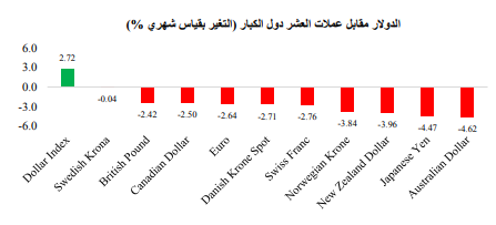 أثر تفوق أداء الدولار عن باقي نظرائه بمجموعة العشر دول الكبار، ليدفع اليورو والجنيه الإسترليني إلى وقف سلسلة مكاسبهم التي استمرت لأربعة أشهر. ومن الجدير بالذكر أن اليورو والين الياباني قد تكبدا أكبر خسائر شهرية لهما منذ شهر أبريل ويونيو على التوالي.