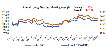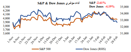 تخلت الأسهم الأمريكية عن بعض أو كل مكاسبها التي حققتها في شهر يناير حيث أصبح المستثمرون أكثر تماشياً مع اتجاه بنك الاحتياطي الفيدرالي نحو تشديد السياسة النقدية عما كانوا عليه في شهر يناير. وانخفض مؤشر داقدية عما كانوا عليه في شهر يناير. وانخفض مؤشر داو جونز إلى أدنى مستوى له منذ نوفمبر. وفي يوم الجمعة الأخير من الشهر، اختتم مؤشر S&P 500 أسوأ أسبوع له منذ أوائل ديسمبر، حيث أثبتت البيانات أن الاقتصاد لا يزال يقاوم تشديد السياسة النقدية وأكد محضر اجتماع بنك الاحتياطي الفيدرالي توجهه نحو المزيد من التشديد النقدي.