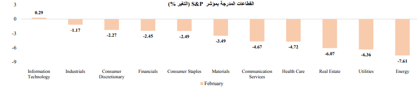 كان قطاع المعلومات والتكنولوجيا الرابح الوحيد من بين جميع القطاعات المكونة لمؤشر ستاندرد آند بورز S&P، بما يتوافق مع الأداء الجيد لمؤشر ناسداك. وفي الوقت نفسه ، كان قطاع الطاقة هو الأسوأ أداء في فبراير، على الرغم من الأرباح القوية التي سجلتها شركات الطاقة الكبرى، حيث أثرت المخاوف من تشديد البنك الاحتياطي الفيدرالي لسياسته النقدية بوتيرة حادة، على توقعات الطلب على الطاقة.