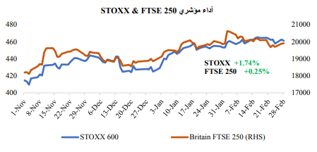 تفوقت الأسهم الأوروبية والبريطانية بشكل ملحوظ على نظيراتها في الولايات المتحدة، حيث ساعد اعتدال درجات الحرارة خلال الشتاء بصورة أعلى من المتوسط الاتحاد الأوروبي على التخفيف من أزمة الطاقة. علاوة على ذلك، ظل المستثمرون متفائلين بأن إعادة فتح الصين ستدعم الاقتصادات ضد مخاطر الركود. الجدير بالذكر أن مؤشر 600 STOXX ارتفع للشهر الثاني على التوالي ليسجل خلال الشهر أعلى مستوى له في عام.