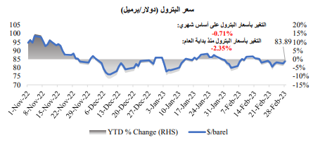 كانت أسعار النفط متقلبة للغاية خلال الشهر، حيث أدى إعادة فتح الصين لاقتصادها الى ارتفاع الطلب وكذلك قرار المملكة العربية السعودية برفع الأسعار الرسمية للشحنات إلى آسيا، وخطة روسيا لخفض الإنتاج إلى زيادة الضغوط على أسعار النفط لتدفعها للارتفاع. في أثناء ذلك، طغت التوقعات بشأن زيادة وتيرة تشديد البنك الاحتياطي الفيدرالي لسياسته النقدية والزيادة الأسرع من المتوقع في مخزونات النفط الأمريكية على العوامل المذكورة أعلاه.