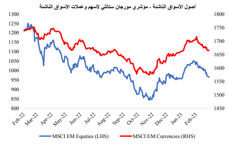 وبعد الأداء القوي الذي شهده شهر يناير، تراجعت أصول الأسواق الناشئة مع تراجع مؤشر مورجان ستانلي لعملات الأسواق الناشئة (MSCI EM Currencies)، ومؤشر مورجان ستانلي لأسهم الأسواق الناشئة MSCI) Equities index )بنسبة 2.24%، و6.54% على التوالي، وهذا بسبب تراجع المعنويات بعد زيادة التوقعات بقيام بنك الاحتياطي الفيدرالي بزيادة وتيرة تشديد السياسة النقدية، وبسبب تزايد الشكوك حول مسار تعافي اقتصاد الصين.