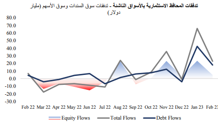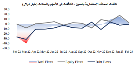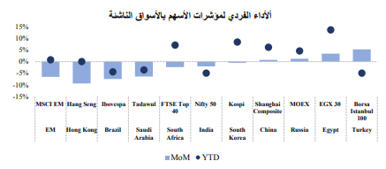 ونتيجة لذلك، تعرضت تدفقات الأسواق الناشئة إلى ضغطنتيجة لذلك، تعرضت تدفقات الأسواق الناشئة إلى ضغط، حيث وصل إجمالي التدفقات لأسهم الأسواق الناشئة إلى 22.9 مليار دولار، أي تراجعت بنسبة 65% بقياس شهري، وذلك في الوقت الذي وصلت فيه التدفقات لسندات الأسواق الناشئة إلى 17.9 مليار دولار، أي انخفضت بنسبة 58% بقياس شهري، حيث كان الانخفاض الحاد للتدفقات مدفوعًا بشكل رئيسي بتراجع التدفقات للأسهم الصينية.