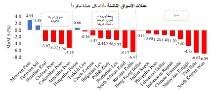 أنهت معظم العملات الرئيسية بالأسواق الناشئة تداولات هذا الشهر على انخفاض حاد مع صعود الدولار لأول مرة منذ أربعة أشهر، وذلك باستثناء عملات البيزو المكسيكي، والسول البيروفي، والليرة التركية والتي تمكنت من تحقيق مكاسب، حيث حقق البيزو المكسيكي مكاسب نتيجة قيام البنك المركزي المكسيكي برفع معدل الفائدة، كما حقق السول البيروفي ارتفاعاً على خلفية هدوء التوترات السياسية، بينما حققت الليرة التركية مكاسب على خلفية تدخل الحكومة المحتمل في السوق.