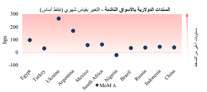 علاوة على ذلك، ارتفعت عوائد السندات الدولية (اليوروبوند) السيادية لأجل 10 أعوام، وذلك في ظل عودة موجة البيع المكثف لسندات الأسواق الناشئة، وتراجع معنويات المستثمرين. ومن الجدير بالذكر أن معظم العوائد قد شهدت ارتفاعًا بأكثر من 30 نقطة أساس، حيث صعدت السندات التي أصدرتها أوكرانيا والأرجنتين بواقع 265.3 نقطة أساس، و168.8 نقطة أساس على التوالي.
