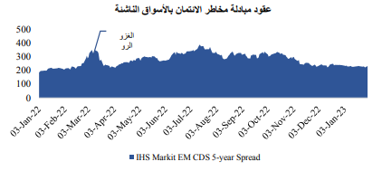 ونتيجة لذلك، ارتفع حجم تداول عقود مبادلة مخاطر ائتمان الأسواق الناشئة خلال هذا الشهر، وذلك حسب بيانات(IHS Markit) الخاصة بعقود مبادلة مخاطر الائتمان لأجل 5 أعوام. وعلى الرغم من أن حجم تداول العقود قد انخفض بشكل كبير مقارنة بالفترة التي قامت فيها روسيا بغزو أوكرانيا، إلا أن مستوى عقود مبادلة مخاطر الائتمان لا يزال أعلى من متوسطها المُسجل تاريخيا.