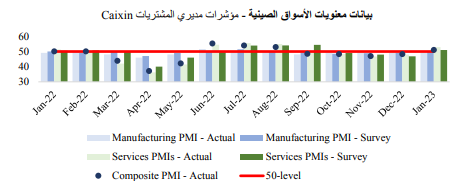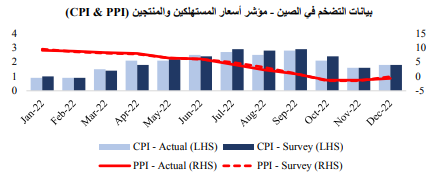 وبشكل إيجابي، أشارت البيانات الصادرة إلى ارتفاع مؤشر أسعار المستهلك لشهر يناير، وهو ما يعكس تعافي معدلات الإنفاق بعد تخفيف سياسة “صفر كوفيد”. وعلى النقيض من ذلك، انكمش مؤشر أسعار المنتجين بشكل طفيف، وذلك في ظل استمرار تأثر قطاع التصنيع، ونتيجة لتراجع أسعار الطاقة.
