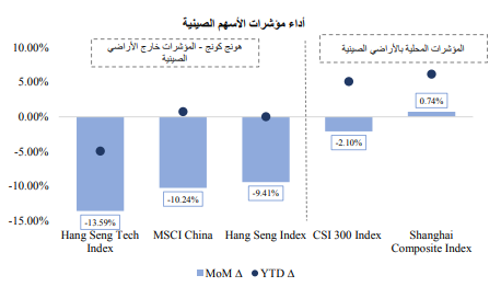 وأخيرًا، كان أداء مؤشرات الأسهم الصينية متباين نسبيًا، حيث انخفضت مؤشرات هونغ كونغ الأكثر انفتاحًا على المستثمرين اؤشرات هونغ كونغ الأكثر انفتاحًا على المستثمرين الأجانب بشكل حاد مقارنة بالمؤشرات الداخلية في الصين والتي تتأثر أكثر بنشاط المستثمرين المحليين.