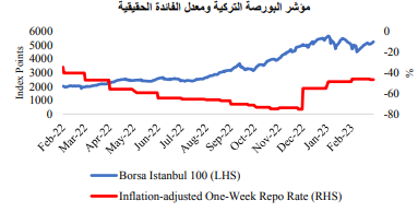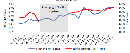كما انخفضت أسهم الأسواق الناشئة نتيجة تراجع معنويات المخاطرة على مستوى العالم، وهبوط الأسهم الصينية. وعلى الرغم من الزلزال الذي ضرب تركيا، حقق مؤشر بورصة إسطنبول 100 مكاسب قوية، حيث فرضت الحكومة بعض الإجراءات الي من شأنها دعم الأصول المحلية.